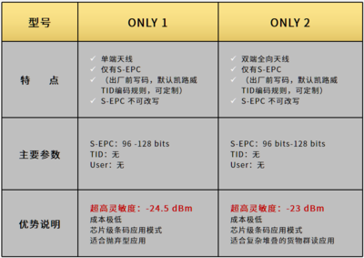 和记官网针对货物面单和抛弃型标签研发的 ONLY 系列只读芯片,灵敏度高达 -24.5 dBm,超低的成本,在业内一骑绝尘,适用于各种复杂堆叠和快速群读场景,是未来千亿级邮包识别市场、万亿级服装和商品管理市场的最优之选。